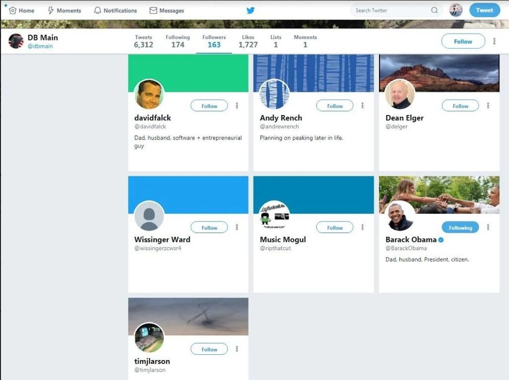 ... threatened me, David Rosler, with death, repeatedly and claimed to "own congress". A quick look at D.B. Main's account shows the second person to follow D.B. Main was Barack Obama's actual official account with 40-something million followers (I saved the HTML of the page to prove it)